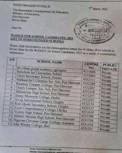 Thirty-five secondary schools have been banned from presenting candidates for the West African Secondary School Certificate Examination, WASSCE over their involvement in examination malpractices in Rivers State.
